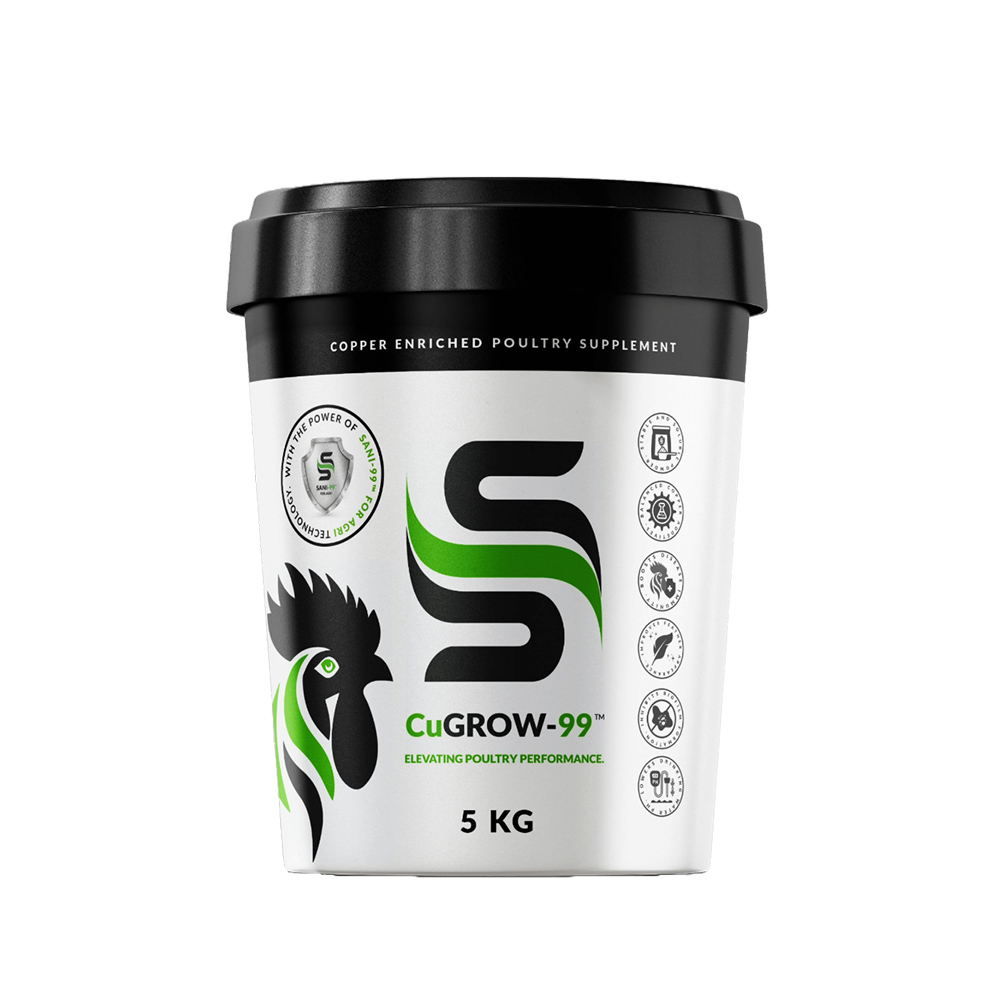 • At its core lies the renowned SANI-99™ for AGRI technology, which forms the bedrock of CuGROW-99™’s effectiveness in poultry health management. This cutting-edge technology plays a pivotal role in optimising the pH levels of drinking water, a crucial factor in enhancing the digestive efficiency of poultry and supplement absorption (overall boost in poultry growth and health).